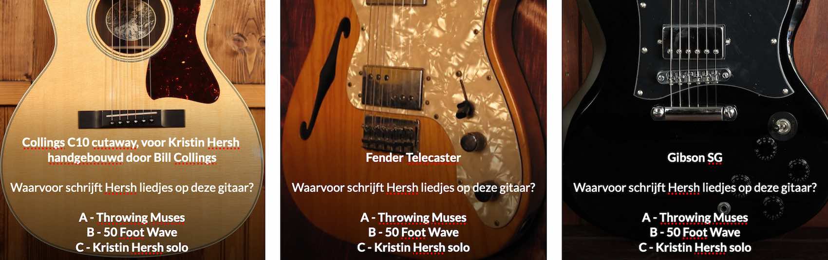 Weet jij welke gitaar Kristin Hersh gebruikt bij het componeren voor welke verschijningsvorm? Stuur de juiste lettercombinatie voor 4 september 2020 – de dag waarop Sun Racket verschijnt – met je naam en adres naar MuziSceneNL@gmail.com onder vermelding van Throwing Muses. En vergeet niet onze pagina op Facebook te liken en/of ons te gaan volgen op Insta!