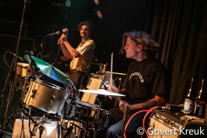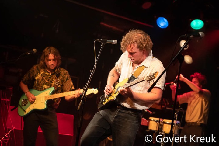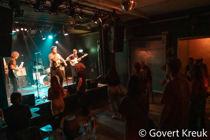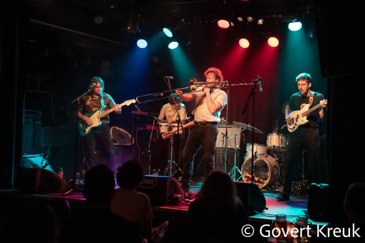 Ondertussen is frontman Jeroen Reek met een trombone op het podium verschenen. Later leer ik dat hij dit instrument sinds zijn elfde speelt, maar vooralsnog moet ik het doen met de mededeling dat het volgende nummer een cover is van Guus Meeuwis. Tegen beter weten in zet ik me schrap en het valt uiteraard allesbehalve tegen. Meeuwis mocht willen dat hij nummers als Cyka Blyat schreef! De tekst beklijft nog niet helemaal, want op het podium ligt een A4’tje als geheugensteun, maar muzikaal en qua tempo zit het helemaal goed. Het is alsof een herfststorm Tram 4 moet halen en de trombone blijkt niet alleen voor de show. Het nummer culmineert van semi-ska naar een jazzy outro, geholpen door het vertragende basspel door Justin Boer en daarmee rollen we vanzelf in de laatste van de vijf nieuwe nummers, Pusherman, dat niets te maken heeft met de hit van soul- en funk legende Curtis Mayfield.