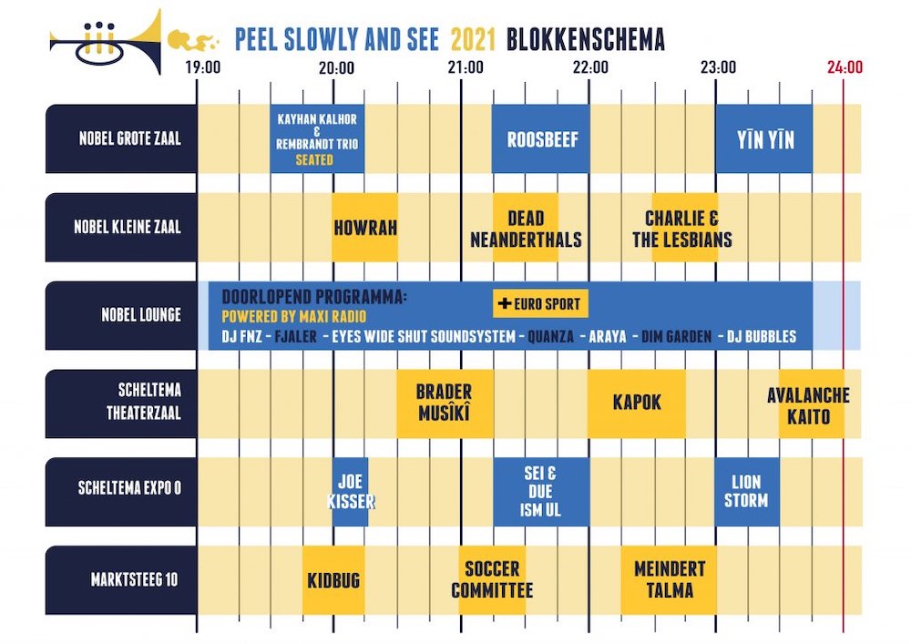 Dit weekeinde kun je starten in Leiden. Daar staat het puike festival Peel Slowly And See gepland. Je kunt in de zalen van Gebr. De Nobel, Scheltema Leiden en Marktsteeg 10 in totaal kiezen uit 16 acts. Allemaal op één avond. Het wordt wel rennen, want dankzij de coronamaatregelen moet de tent wel weer om 12 uur dicht, godbetert. Ons lijkt het onmogelijk te kiezen, maar MuziScene beveelt in elk geval Howrah en Charlie & The Lesbians van harte aan.
