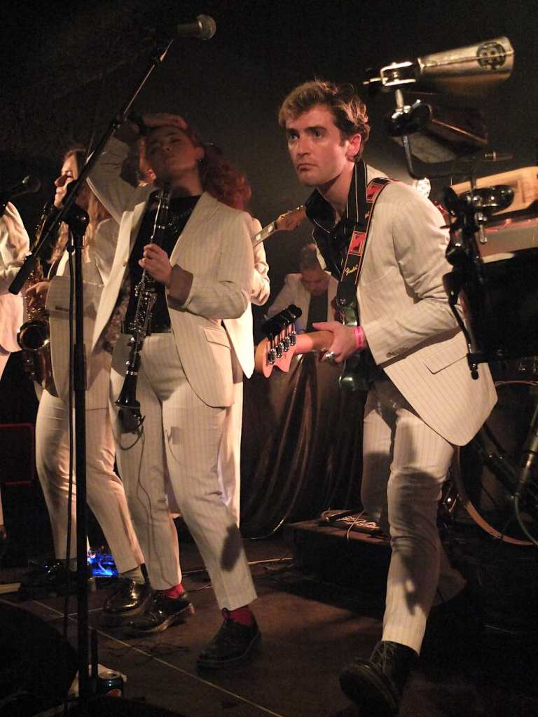 In Perron verzamelt zich opnieuw het groepje liefhebbers van dansbare indie waar het negen koppende tellende Fake Turins klaar staat om de draad van Youth Sector feilloos op te pakken. Alleen komt dit gezelschap uit Noord-Londen en neemt in vergelijking met hun collega’s uit Brighton dito poeha met zich mee. Is Youth Sector streetwise punkfunk, Fake Turins is de upper class versie. Het is een indrukwekkend gezicht, negen mensen in roomwitte pakken. En wat zij voortbrengen is al even adembenemend: een groots geluid met blazers, toetsen en felle percussie. En op de momenten dat alle negen de refreinen meebrullen, bijna Arcade Fire-achtig overrompelend. Fake Turins staat borg voor een dampende disco show. In het centrum van de storm staat de boomlange baas van de band Dominic Rose. Dat hij de scepter zwaait wordt pijnlijk duidelijk als hij de band stillegt omdat een gitarist verkeerde akkoorden speelt. Mede dankzij zijn voorkomen en aanwezigheid ontkom je er niet aan om aan Talking Heads te denken. Ook in zijn vocalen sluit hij soms angstvallig aan bij David Byrne. Rose combineert de voordracht met het spelen van zijn bas. Hij speelt afgemeten baspartijen, functioneel binnen de volle discosound. Dat gaat hem prima af, zolang hij niet beide tegelijk hoeft te doen. Om hem heen doet iedereen geconcentreerd zijn werk. De percussioniste, op blote voeten, grijpt telkens met haar tenen de voet van haar instrument vast. Zo fysiek kan muziekmaken aanvoelen. Zo fysiek reageert het publiek in Perron dat met volle teugen geniet en de benen moe danst.