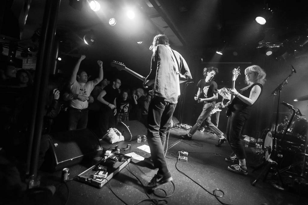 En jawel hoor, Left of the Dial is begonnen en hoe fijn is het dan om al snel naar English Teacher uit Leeds te mogen luisteren en vooral ook om te mogen aanschouwen; het oog wil tenslotte ook wat. Want hoe lieflijk en onschuldig leadzangeres Lily Fontaine er ook uitziet, schijn bedriegt! Terwijl zij lachend op het podium zingt, swingt en gitaar speelt, spuwt ze met haar goedmoedige en onschuldig klinkende stem de één na de andere hachelijke en ongemakkelijke situatie in volzinnen uit haar mond. ‘Take my freedom, take my treasure’ en ‘When it’s time for desert I will eat your laughter’, eat this! Muzikaal gezien zit het prima in elkaar. Loepzuiver, dansbaar en strak gespeeld, met lekker veel distortion. De band kreeg de zaal gemakkelijk mee, de toeschouwers leken tevreden en juichten en klapten vol overgave. In het laatste nummer dat ze spelen, R&B, hun op een na laatste singel release van april dit jaar, klinken invloeden van Sonic Youth door, als een kers op de taart. De urgentie dringt door om geboeid te blijven luisteren en kijken tot het eind. Het publiek zei achteraf: ‘Hey, dat was een goeie, mooie show!’. En dat ben ik absoluut met ze eens!