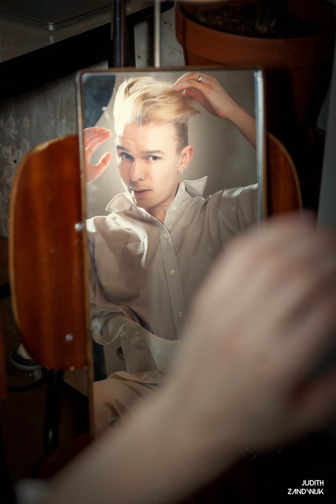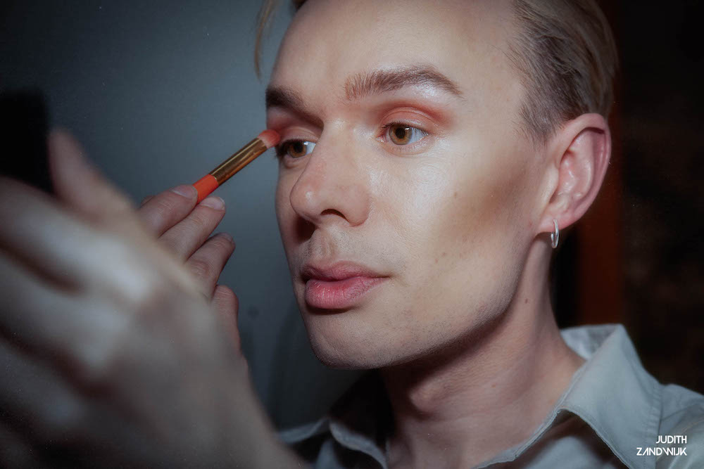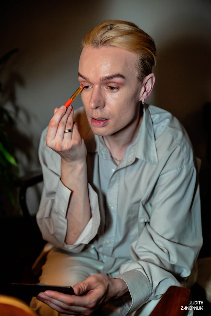 Via de spiegel van de geïmproviseerde kaptafel spreken we over zijn grote waardering voor Nikkie Tutorials. Dare blijkt volledig op de hoogte van haar gedwongen coming out als transgender, overval en YouTube-kanaal.