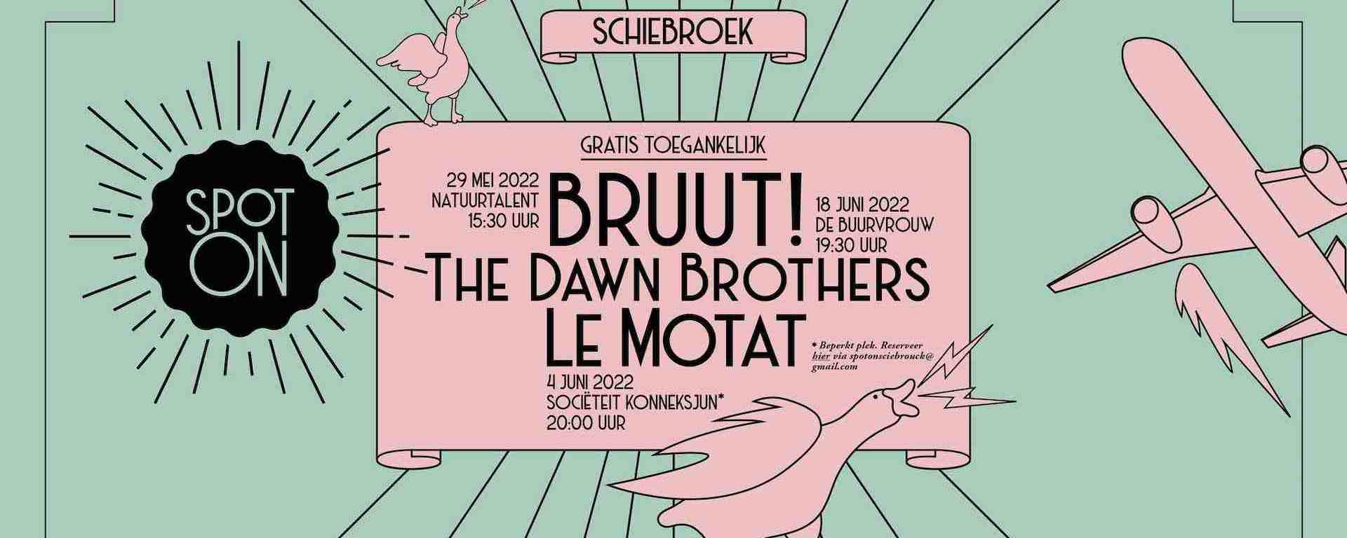 Het optreden van BRUUT is een eerste in een rij van drie die het festival Spot On Sciebrouck een soort van inleiden, zeg maar. Naast Bruut kun je zaterdag 4 juni Rotterdams eigen LE MOTAT zien en zaterdag 18 juni Dawn Brothers. Meer info over tijden en waar je precies moet zijn – ja ook al woon je in een andere wijk – vind je op de pagina van het festival. De hoofdmaaltijd wordt trouwens zaterdag 27 augustus geserveerd. Zet het maar vast in je agenda. Zo’n Spot On wil je toch ook gewoon in je eigen wijk?!
