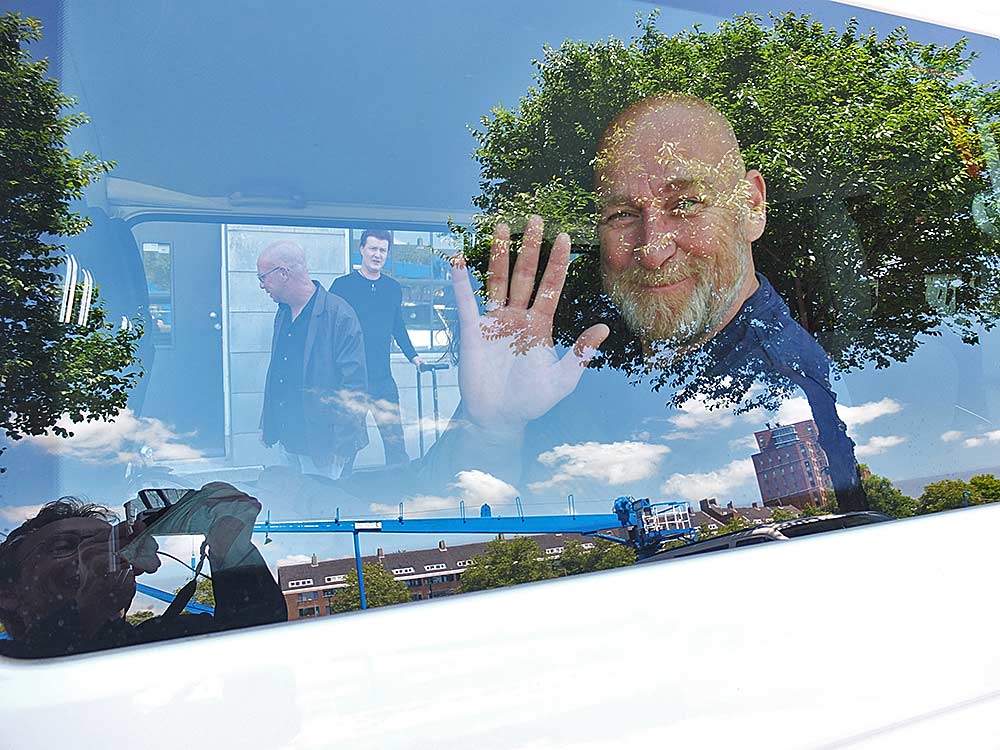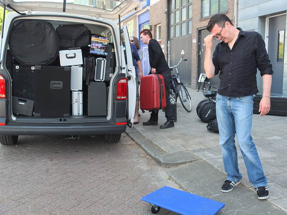 Het liftje van De Frikandel zucht onder het gewicht van de versterkers en de hardware van het drumstel. Zanger-gitarist Stooker trekt een koffer uit de handen van een van zijn bandmaten. ‘Geef maar hier’, in puzzel het wel in elkaar’. Het busje van Hartman is een beetje aan de krappe kant. Naast mijzelf is er nog een vriend die mee mag. En de hele mikmak van een band van vier mensen moet er ook in. Gelukkig verkiest gitarist Jeroen zijn eigen vervoer. Speciaal om hem te zien spelen zijn twee nichtjes voor een enkele dag over uit Israël, en die kan hij dan mooi meenemen in zijn eigen auto. Stooker ginnegapt met drummer Ronald over wie er nu eigenlijk het beste in kan pakken, terwijl hij met een timmermansoog een doos in een gaatje schuift. ‘Met je peen en uien-verhaal’ klinkt het onderlinge gemoedelijke geplaag oer Rotterdams en af en toe bijpassend grofgebekt, vol grappen waarvoor je tegenwoordig zonder meer gecancelled zult worden. Het past, net…. Ray en Ronald worden ingebouwd achter een muur van gitaarkoffers. Nee, onderweg plassen zit er even niet in. De deuren gaan nog dicht en weg zijn we, op weg naar Amersfoort.