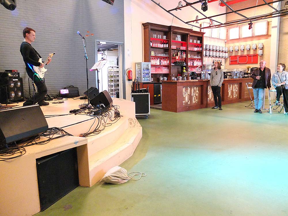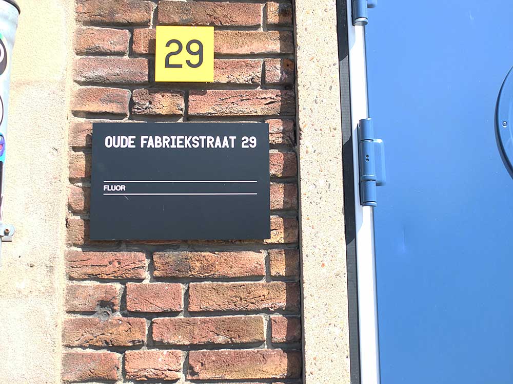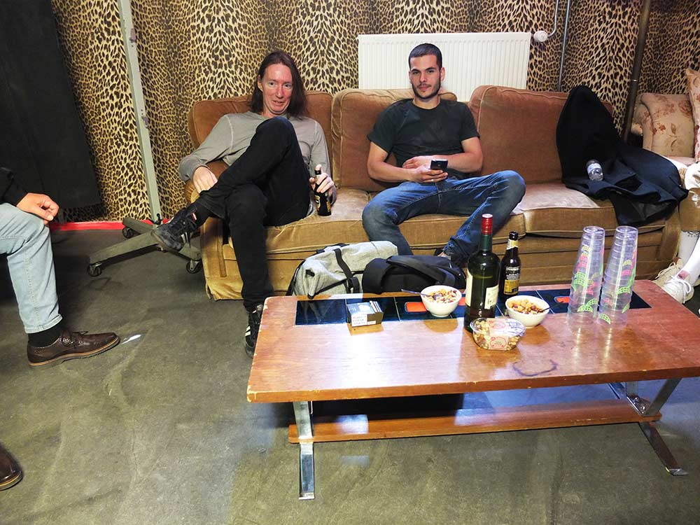 Klokslag vier uur arriveren we bij Fluor in Amersfoort. ‘De enige band die altijd precies op tijd is’, schaterlacht de hele bus. Nu nog de ingang vinden. Na nog een rondje door de stad stuurt Stooker opnieuw de straat in waar het zou moeten zijn en na wat navraag wordt de deur met daar netjes op geschreven ‘Fluor’ dan toch gevonden. Zijn ze toch nog een paar minuten te laat…