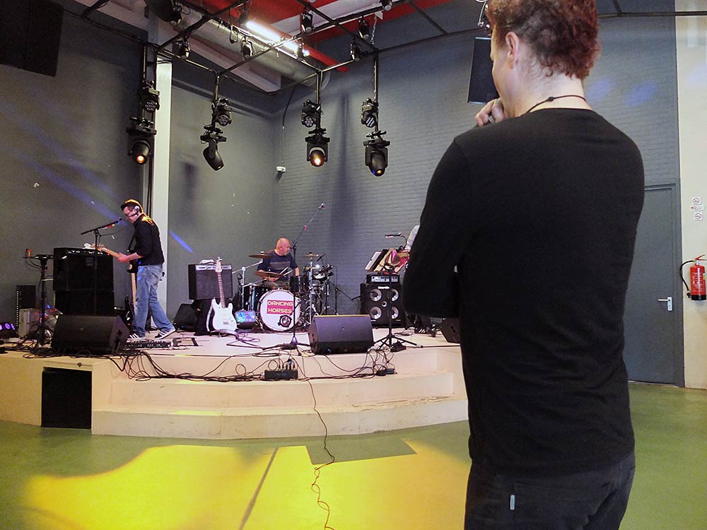 Tijdens de soundcheck worden de punten op de i gezet. En wordt eenieder zakelijk bij de les geroepen om te presteren. Discussie is er over hoe de telling van de backing track bij een nieuw ingestudeerde song – Bad van U2 – precies verloopt en op welk moment moet worden ingevallen. Dancing Horses werkt in veel liedjes met een geluidsopname die meeloopt terwijl zij spelen. Daarbij maken ze gebruik van sporenopnamen die op internet te vinden zijn van veel klassiekers. De kenmerkende baspartij bij de intro van Waterfront van Simple Minds bijvoorbeeld wordt zo slim ingezet om het origineel zo dicht mogelijk te benaderen. Niets kunstmatig is er verder aan het spel van de band. En de stem van Stooker is met je ogen dicht alsof Bono hoogstpersoonlijk vanavond in Fluor aanwezig is. Bovendien stelt de techniek die de band gebruikt hoge eisen aan met name drummer Ronald die zich in tempo precies moet houden aan de meelopende clicktrack, maar ook de structuur van elk nummer moet volgen. Elke afwijking is – zo demonstreerde Kiss onlangs – in principe fataal. Zorg is er alleen over de geluidsmensen van Fluor. Professionals die hun vak goed verstaan, maar zij zijn te jong om het vanavond gespeelde repertoire goed te kennen. En dus ook niet weten hoe hard de backingtrack moet staan om dat origineel te benaderen. De meegereisde gasten worden ingeschakeld om dat probleempje te tackelen: zij zullen de geluidsmensen bijstaan tijdens de show.