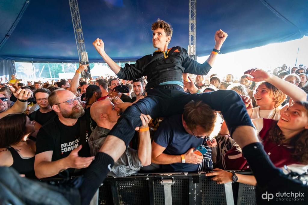 Dat geldt ook voor Le Motat. Het is nog vroeg en de zon schijnt nog niet voluit, maar toch probeert de formatie rond frontman Tato Wesselo er een heus feestje van te maken met hun dansbare beats, absurde teksten en pakkende liedjes. Maar ondanks het vol gestroomde veld heeft Le Motat het publiek niet mee. Er wordt volop geapplaudisseerd en gejoeld na ieder nummer, maar nauwelijks gedanst. En dat ondanks de oproep van Wesselo – „Dit is het laatste nummer en wat doe je dan?” – krijgt hij het enthousiasme er, in elk geval niet zichtbaar, niet in. Jammer, want echt een lekker, dansbaar, strak en feestpotentieel optreden met als epicentrum Wesselo die een fijne energie uitstraalt.