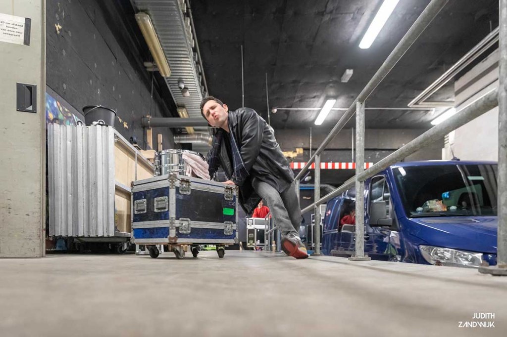 Het zevenkoppig collectief verdeelt de taken en al snel worden alle spullen uitgeladen en de instrumenten naar het podium gebracht.