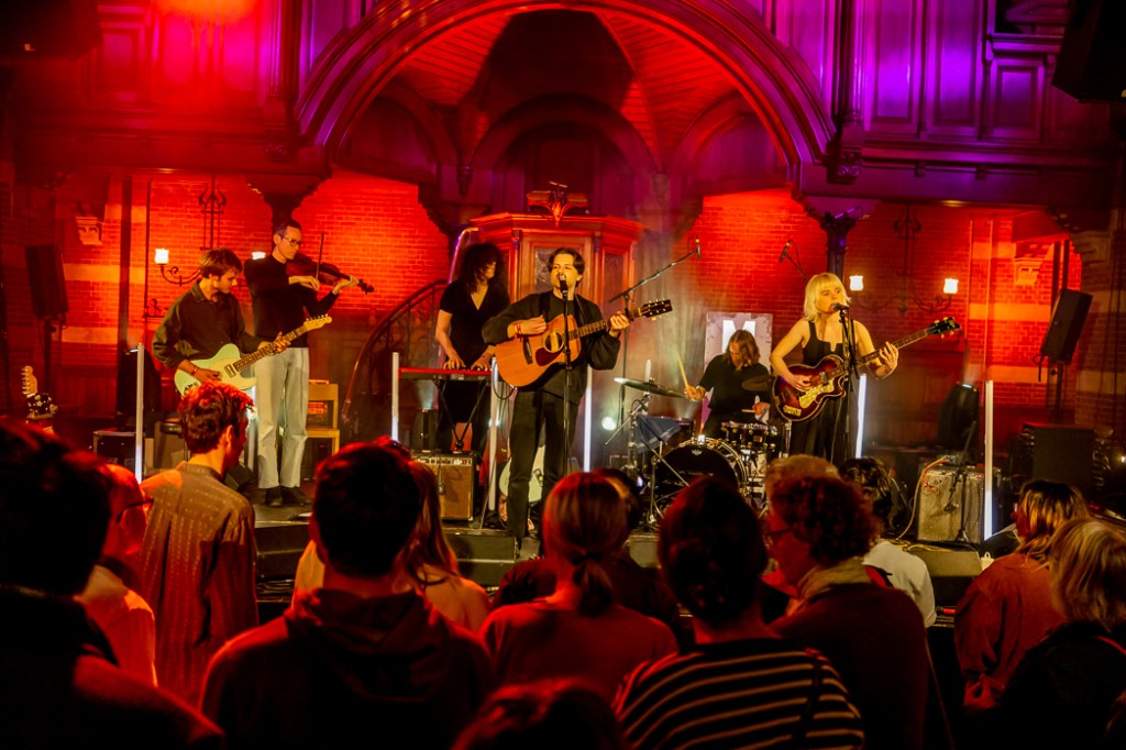 Hoewel ik na Yard Act een tweede hoogtepunt op zak heb, begeef ik me toch nog even naar de Arminiuskerk voor wat uiteindelijk de kers op de taart blijkt. Nagasaki Swim lanceert er zijn nieuwe album Everything Grows. Rotterdamse zanger/gitarist Jasper Boogaard weet zich in tegenstelling tot Waxahatchee wel gesterkt door een veelzijdige band en dat blijkt een goede zet want zijn set, die bestaat uit een prettige mix van oude en nieuwe nummers, weet wel van begin tot einde te boeien. Uiteraard mag The Weight niet ontbreken. Beide delen, worden na elkaar gebracht. Het eerste deel van debuutalbum The Mirror speelt Boogaard solo op akoestische gitaar, maar wanneer de band, waaronder Arie van Vliet (Lewsberg) op viool en Kat Kalkman (Library Card en Neighbours Burning Neighbours) op piano hem vergezelt voor het tweede deel krijgt het nummer meer body en letterlijk meer gewicht. Toch weet Boogaard het met zijn zang intiem te houden voor het niet in hele groten getale aanwezige publiek. De wegen van festivalpubliek zijn ondoorgrondelijk, maar ik prijs me meer dan gelukkig dat ik erbij was en schaf na afloop met liefde de pas bij Excelsior Recordings verschenen geluidsdrager op vinyl aan: een uitstekende souvenir aan een geslaagd optreden en een geslaagde eerste volledige festivaldag.