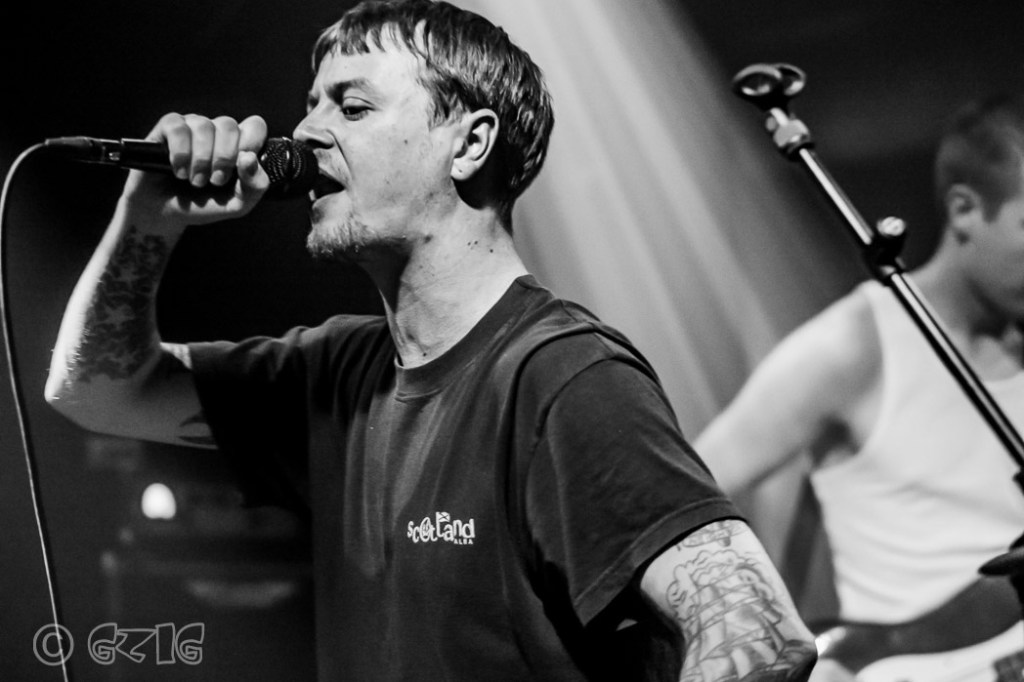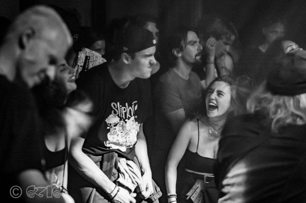 De een luisterde overwegend naar heavy metal, de ander nam ook hiphop tot zich. Dat hoor je in de mix van Yabba, die we voorheen misschien met een vaag begrip als ‘crossover duidden. De nummers geven er blijk van dat de Schotten wars zijn van traditionele songstructuren. En toch komt hun muziek niet uit het luchtledige; bij vlagen komt het wel heel dicht in de buurt van wat voorheen Faith No More en Rage Against The Machine deden, en als Josh Kirk’s zang ritmisch wordt en op rappen gaat lijken, horen we vleugjes Urban Dance Squad doorklinken. Op internet is het nog vergeefs zoeken naar muziek van de Schotten, er staan maar twee singles op Spotify. Zanger Josh Kirk refereert er aan als de band al vroeg in de set Get By inzet, een van de twee singles. Het beukende ritme is kenmerkend voor de richting waarin Yabba zich lijkt te ontwikkelen. Roodkapje stroomt weer vol bij deze klanken en al snel wordt het onrustig op de dansvloer voor het podium. Yabba is met name dankzij de verschijning van Kirk ronduit imponerend, zo niet angstaanjagend. Midden op zijn buik prijkt in grote letters ‘No Surrender‘. Kortgeschoren haar, tenger van postuur, zo weggelopen uit de filmset van Trainspotting. Hij legt niet of nauwelijks contact, lijkt in zijn eigen wereldje te verkeren terwijl hij agressief bewegend al schreeuwende met rood aangelopen hoofd rondbanjert. Alleen als hij voorop het podium gaat staan, zich in lengte uitrekkend, staart hij zijn toehoorders aan en komt heel dichtbij. ‘Mayhem‘, de fans gaan daarop los. Die poses van de zanger, gecombineerd met de beukende dansbare ritmes en de zware industriële sound, dat maakt Yabba een live-act van jewelste.