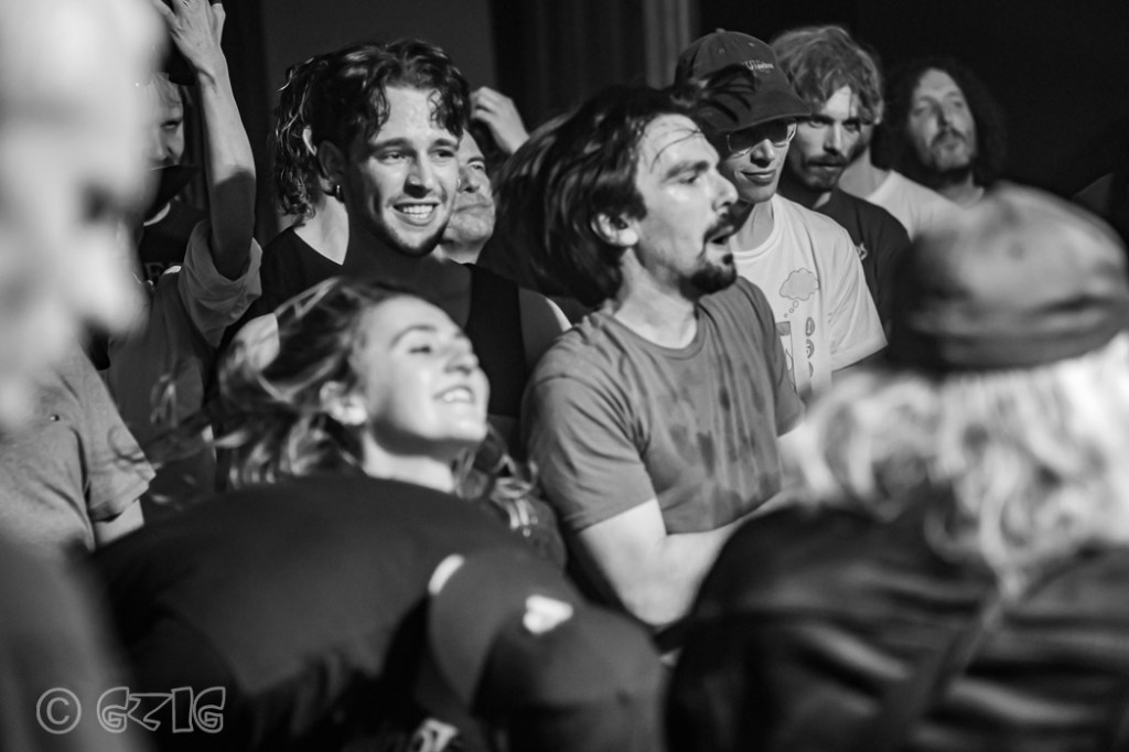 M.U.G. raast in een kwartiertje door de set heen. De stijl ligt niet te ver af van wat van deze groep muzikanten eerder op de mat legde. Punk, hardcore, bulderende vocalen, recht-toe-recht-aan, maar soms gaat het gas er even af, duikt Croes naar de grond en volgt er even bezinning. Het kersverse repertoire van de band die zo’n jaartje met elkaar bezig is, bestaat uit liedjes die spontaan en snel ontstonden. De nummers waar wat langer aan moest worden gesleuteld, liggen in de prullenbak. Niet alles is nog af. Op de setlijst heet een nummer ‘Snel‘, omdat het nog geen definitieve titel heeft. En dat hoor en zie je in Roodkapje. M.U.G. draalt niet maar gaat er met gestrekt been in. Vol overtuiging, vol energie. Het rammelt, het kraakt, het schuurt. Croes trekt al direct zijn shirt uit en spuit een mond vol bier de lucht in. Hij kruipt, hij wankelt, hij steekt zijn vinger diep in zijn keel om te zien of er nog meer vocht uit te halen is. Wat maakt een goede M.U.G.-song? ‘Herrie’, legt Croes uit met een glimlach. Maar daarmee is het niet klaar, want een nummer moet wel iets hebben, een randje, dat de aandacht trekt. M.U.G. is binnenkort weer te zien in Rotterdam tijdens Left of the Dial.