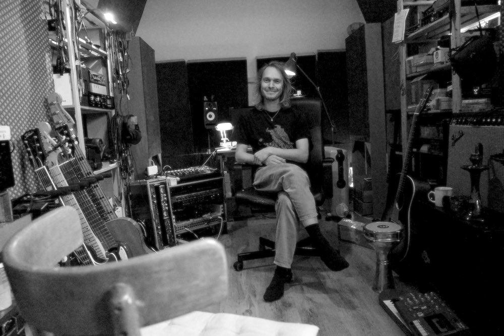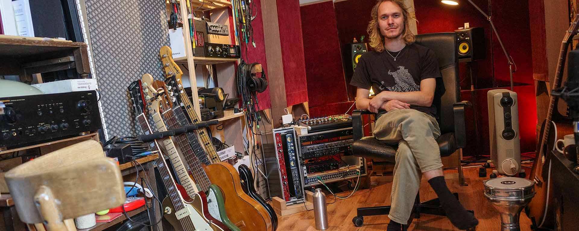 Door de gang links komen we in een hele andere wereld. In een kleine kamer is het volgepakt met instrumenten en apparatuur, en kastjes vol cassettebandjes. Op de grond ligt een blauwe Tascam viersporen-recorder: geliefd apparaat bij iedereen die ervan houdt zichzelf beperkingen op te leggen en lo-fi kan waarderen. Dit is de natuurlijke habitat van liedjesschrijver Jelle Haagsma, alias Jellephant, de bijnaam die een klasgenote op de middelbare school hem schonk en hij nu nooit meer vanaf komt. Het kamertje is de plek waar hij zichzelf kan zijn, waar hij zich thuisvoelt en veel van zijn tijd doorbrengt. Niet enkel om aan eigen werk te sleutelen, ook om aan de muziek van anderen te sleutelen.
