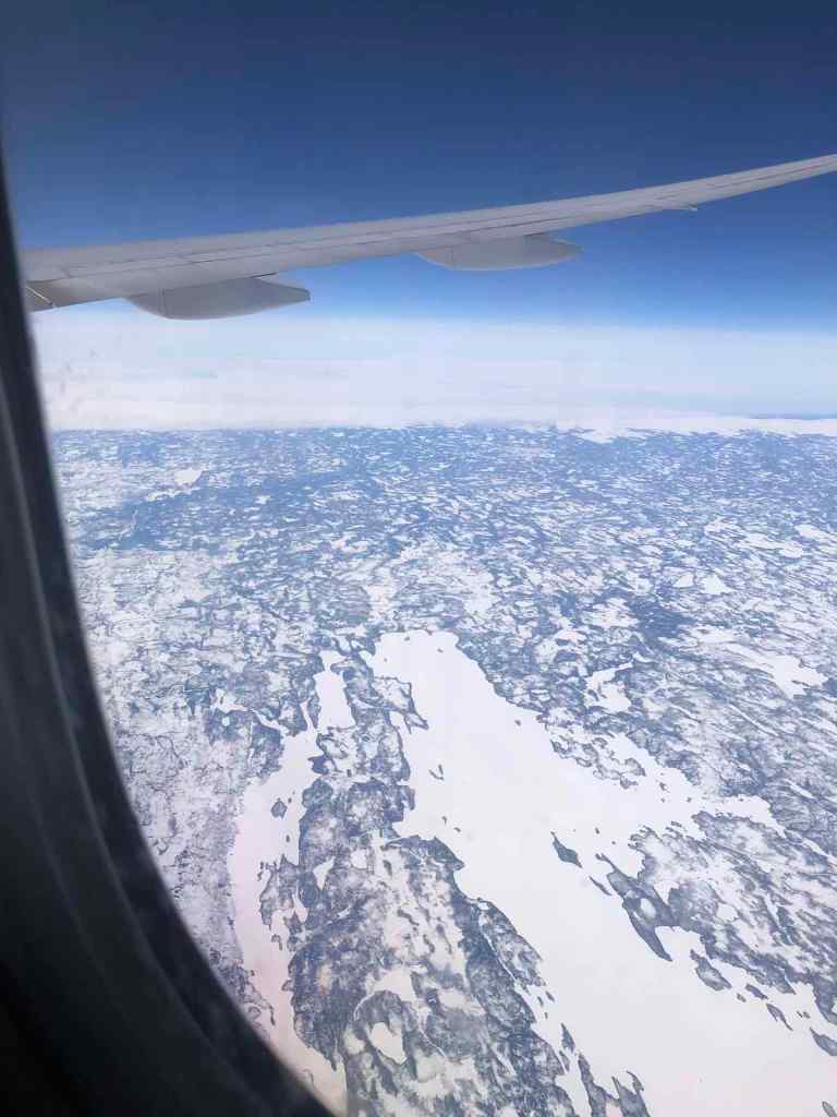 Tot aan het hoge Noorden van Canada keken we neer op een dik wolkendek. Tot mijn grote vreugde verdwenen daarna de wolken en zat ik aan het raam gekluisterd, de grootsheid en leegte van de wereld bewonderend. Gletsjers, bevroren baaien en toendra’s maakten langzaam plaats voor de bewoonde wereld. De Great Lakes, Chicago, St. Louis en Little Rock trokken aan mijn zicht voorbij.