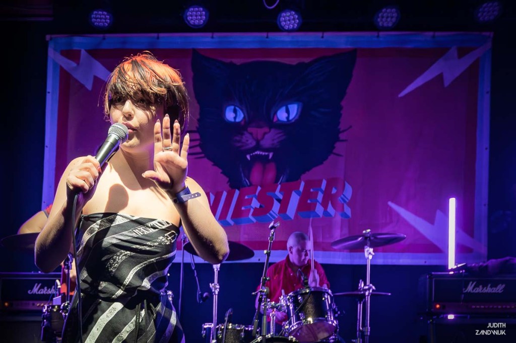 Dat geldt zeker ook voor afsluiter in de kleine zaal van Paard deze avond Big Special. Drummer Callum Moloney neemt een half uur voor de show begint de situatie in zich op, kijkt eens rond op het podium en in de zaal. Hij balt zijn vuist: deze man heeft er zin in. Hij fungeert als stadionspeaker tijdens de zinderende show van het duo uit Birmingham. Behalve met zijn opzwepende kreten voert hij met zijn pompende intense drumspel – doet toch regelmatig aan The Ting Tings denken – de ene na de andere song naar een hoogtepunt. Shithouse! Is dat al indrukwekkend, dan hebben we het nog niet gehad over de stem van Joe Hicklin. Dat heb je nog niet zo direct door als hij praatzingt cq rapt. Nee, als hij dan in de refreintjes overschakelt naar zijn zangstem komt het pas echt aan. Die bulderende bariton, telkens precies op tijd extra vet aangezet met een laagje reverb, zorgt voor de Big in Big Special. Voeg daar het uitstekende songmateriaal met snerpende teksten van de onlangs verschenen plaat Postindustrial Hometown Blues bij en Big Special is met recht ‘pretty special‘ en een act die je het komende festival seizoen niet mag missen. Hoewel, in de kleine zaal is duidelijk dat het niet ieders kopje thee is; een deel van het publiek kiest al snel het hazenpad. Om daarmee iedereen die er wel zichtbaar intens van geniet een beter uitzicht te gunnen.