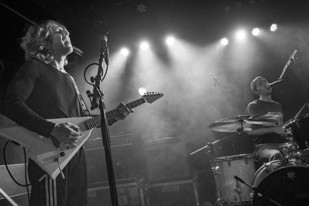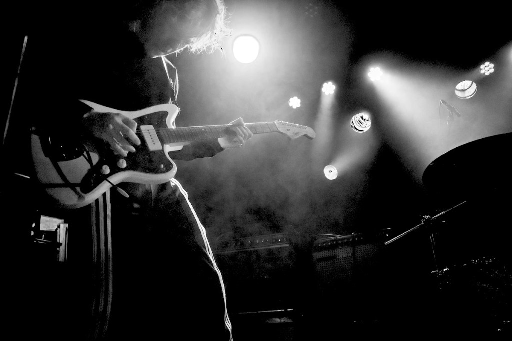 Texoprint. Jasper Werij, David Pop en Redwin Rolleman leverde onlangs hun ep Mumble af waarin de ongenaakbare noise die zij maakten toen zij nog onder de naam Kalaallit Nunaat opereerden meer nuances en ‘popfeel’ krijgt. Het trio raast op een dollemanstempo door hun set en kiest voor vanavond een flink deel van het ruigere werk. Stormachtig, overdonderend, en enkel een liedje als Push It Down geeft het nog nauwelijks van de avondmaaltijd bekomen publiek even een adempauze. Visueel is de band uit Rotterdam net zo indrukwekkend als wat er uit de boxen schalt. Als slangenmensen wringen Werij en Rolleman hun lichaam in onmogelijke bochten, waarmee we in beeld uitgedrukt zien wat we ook mogen menen te horen in de wringende akkoorden, verbluffende roffels vanaf de drumkit en de vloeiende baslijnen: melancholie, hart- en hersenpijn. Texoprint sluit hun set af op vol volume en op een donker podium alsof zij de avond besluiten en iedereen nu naar huis mag. Maar dan moet de hoofdact nog komen.