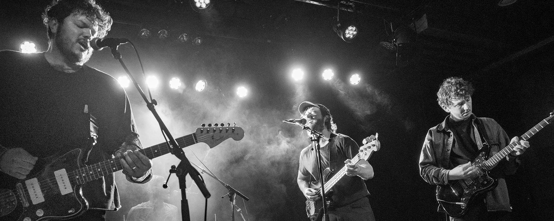 Texoprint. Jasper Werij, David Pop en Redwin Rolleman leverde onlangs hun ep Mumble af waarin de ongenaakbare noise die zij maakten toen zij nog onder de naam Kalaallit Nunaat opereerden meer nuances en ‘popfeel’ krijgt. Het trio raast op een dollemanstempo door hun set en kiest voor vanavond een flink deel van het ruigere werk. Stormachtig, overdonderend, en enkel een liedje als Push It Down geeft het nog nauwelijks van de avondmaaltijd bekomen publiek even een adempauze. Visueel is de band uit Rotterdam net zo indrukwekkend als wat er uit de boxen schalt. Als slangenmensen wringen Werij en Rolleman hun lichaam in onmogelijke bochten, waarmee we in beeld uitgedrukt zien wat we ook mogen menen te horen in de wringende akkoorden, verbluffende roffels vanaf de drumkit en de vloeiende baslijnen: melancholie, hart- en hersenpijn. Texoprint sluit hun set af op vol volume en op een donker podium alsof zij de avond besluiten en iedereen nu naar huis mag. Maar dan moet de hoofdact nog komen.