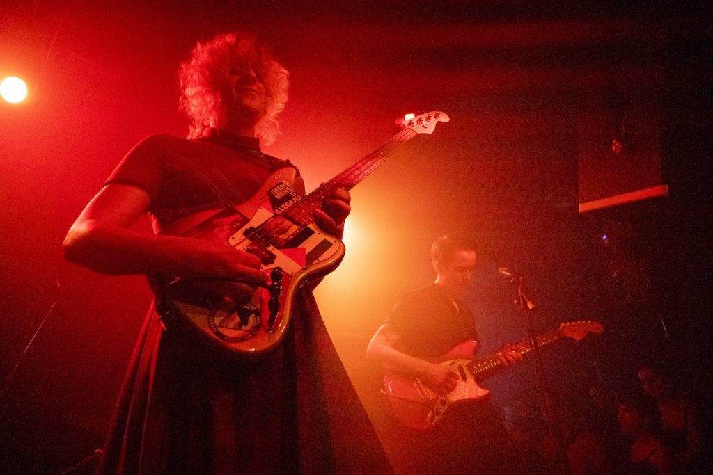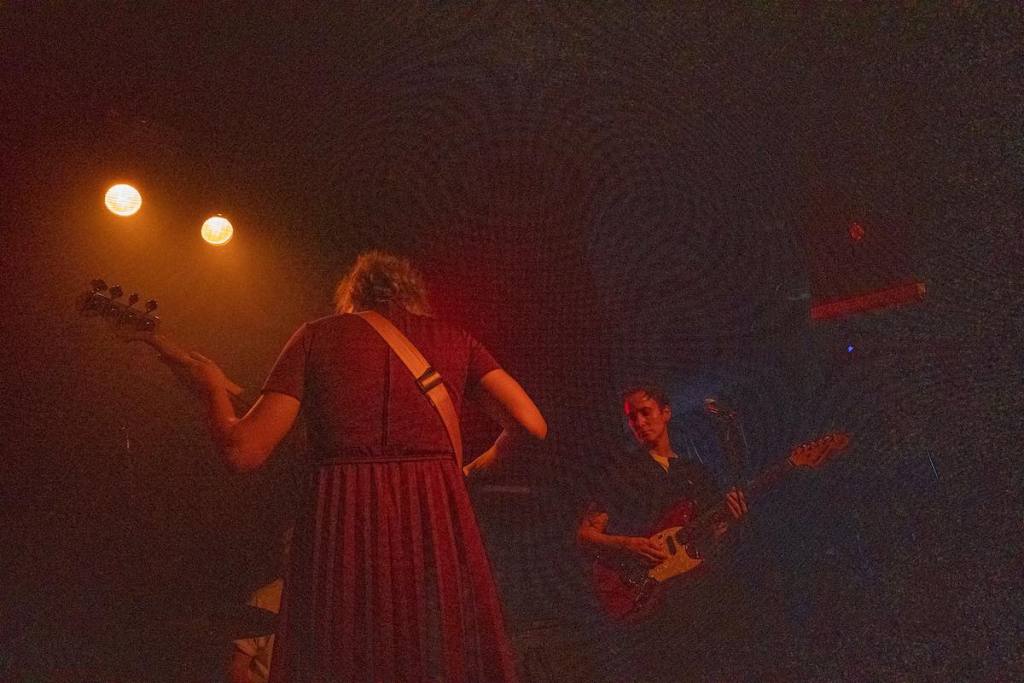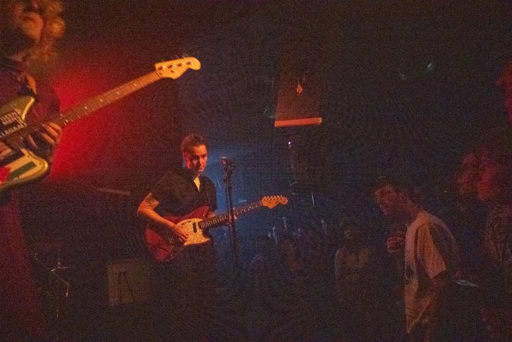 Goed, zover het feestgedruis. Het hoofdgerecht bestaat uiteraard uit het concert van Neighbours Burning Neighbours. In de in bloedrood licht gehulde ruimte – mooi passend bij de hoes van de plaat – werken Daani van den IJssel, Alicia Breton Ferrer, Aram Scheeve en Kat Kalkman een korte maar felle set af. Ze trappen af met Catharsis, niet bepaald het luchtigste liedje van Neighbours Burning, maar qua volume wel direct voluit. Vrijwel de volledige plaat komt langs. Maar je knippert twee keer met je ogen, en het is al weer voorbij. ‘Ahhh, de laatste’, gilt ook Alicia Breton Ferrer uit als Familiar Place wordt ingezet, het nummer dat tijdens de opnamen ontstond en misschien wel een van de pakkendste tracks op het album. Iedereen wordt bedankt en, zoals dat past bij een collectief van betrokken en bevlogen mensen, wensen uitgesproken voor de vrede en vrijheid waar maar mogelijk. Mooiste moment van de dag: als Alicia en Daani om Kat Kalkman heen oogcontact proberen te zoeken om hun staccato zang op elkaar te timen. Grandioos!